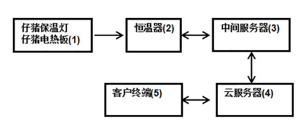 恒溫器設定好仔豬適宜的溫度區間以及保溫燈和電熱板的工作狀態,再把保溫燈和仔豬電熱板的運行數據與中間服務器、云服務器進行交互;