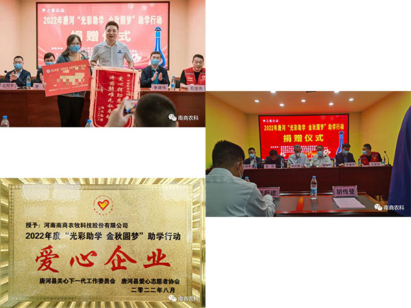 2013年,南商農科董事長曹沛先生積極響應家鄉號召,于南陽市唐河縣成立河南南商農牧科技股份有限公司。如今,南商農科依然不改初心,砥礪前行,以家鄉振興為己任,在今年的鄉村振興公益活動中,南商農科作為唐河縣慈善總會會員單位,積極助力唐河鄉村振興公益事業。